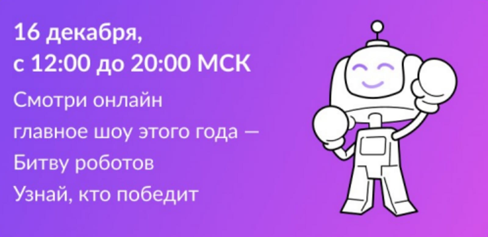 16 декабря 2023 года в Москве пройдут полуфинал и финал Международного чемпионата по битве роботов. В соревнованиях примут участие 16 команд из России, Китая, Турции и Индии. Зрителей ждет два шоу (с 11:00 до 20:00 по московскому времени), а также познавательная программа. За битвой роботов можно будет наблюдать в сети «Интернет» по адресу https://vk.com/video-219465931_456239497.
