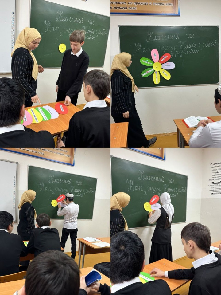 22.01.2025МБОУ «Майртупская СШ № 3 имени Салманова Л.С-А»22.01.25г. учитель чеченского языка и литературы Байхаджиева Ж.провела классный час на тему "Жить в мире с собой и с другими" для учащихся 8 класса.На этом мероприятии ученики обсудили важность саморазвития, принятия себя и умения строить гармоничные отношения с окружающими. Преподаватель инициировал дискуссии о том, как успешное взаимодействие с людьми и внутренний комфорт влияют на качество жизни. Учащиеся узнали о навыках эмпатии, активного слушания и конструктивного общения, которые помогают наладить взаимопонимание с другими.